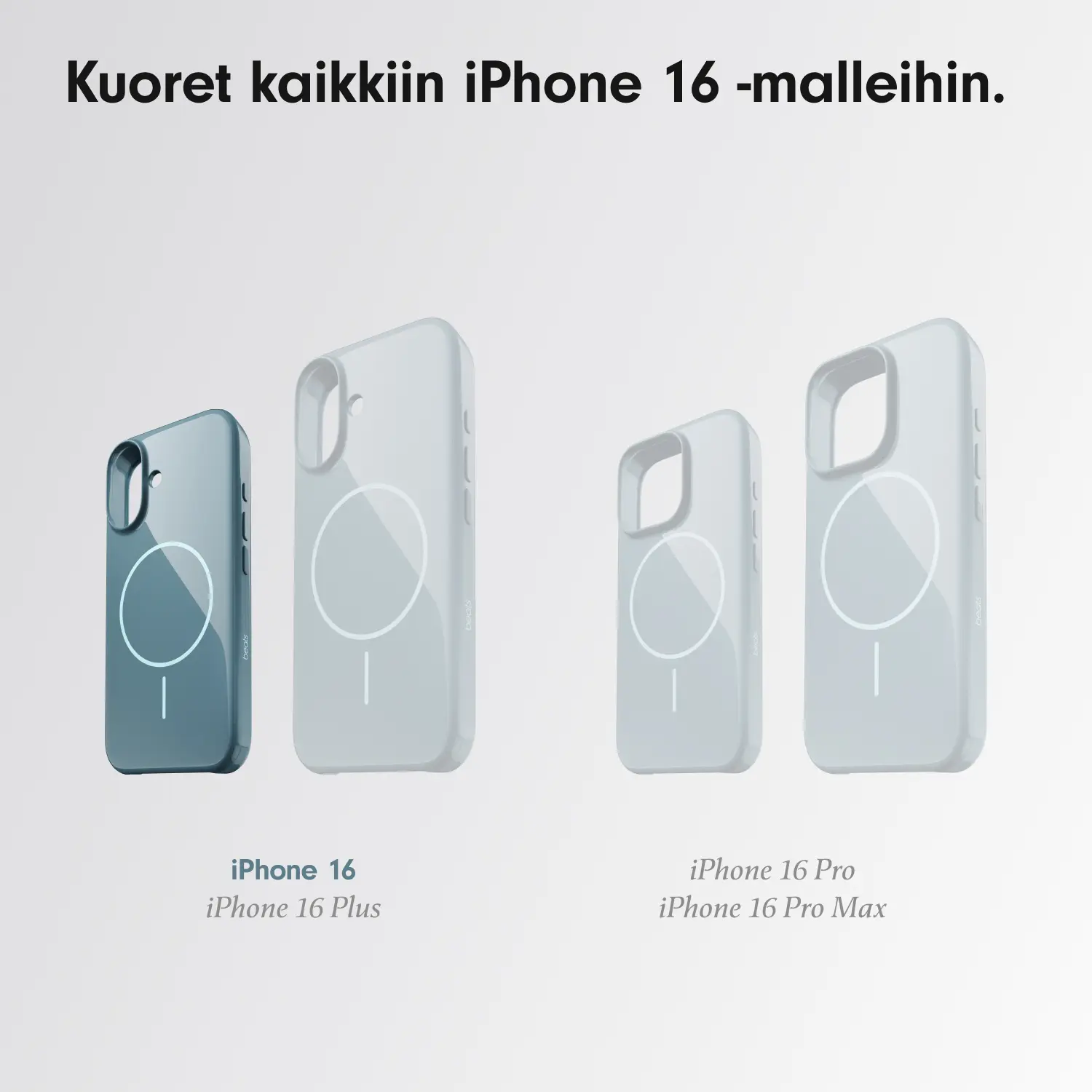 - Kaikki neljä kuorikokoa ovat MagSafe-yhteensopivia, ja niiden sisäiset magneetit kohdistuvat täydellisesti vastaavaan iPhone 16 -malliin varmistaen helpon kiinnityksen ja tehokkaan langattoman latauksen.