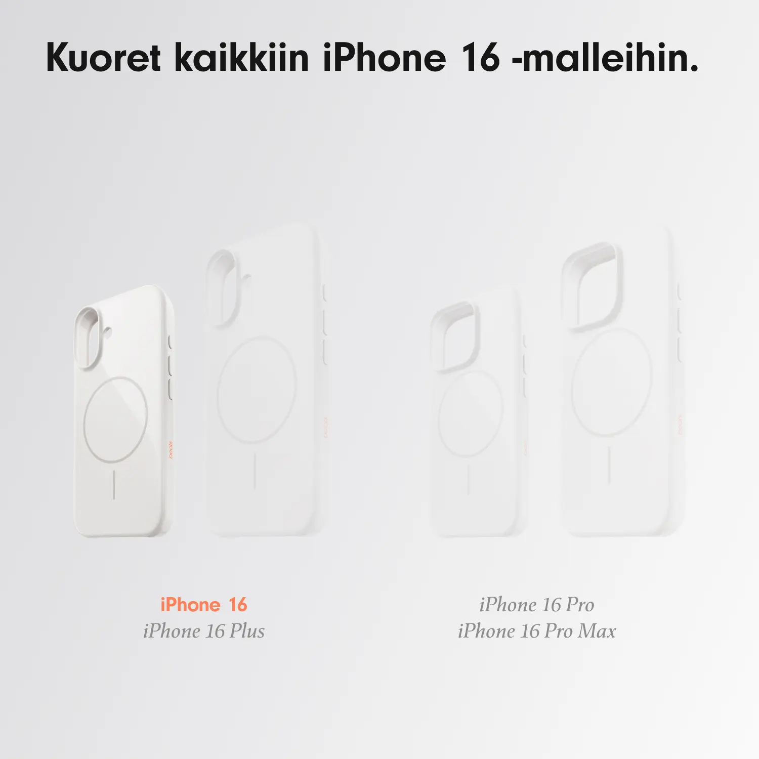 - Kaikki neljä kuorikokoa ovat MagSafe-yhteensopivia, ja niiden sisäiset magneetit kohdistuvat täydellisesti vastaavaan iPhone 16 -malliin varmistaen helpon kiinnityksen ja tehokkaan langattoman latauksen.