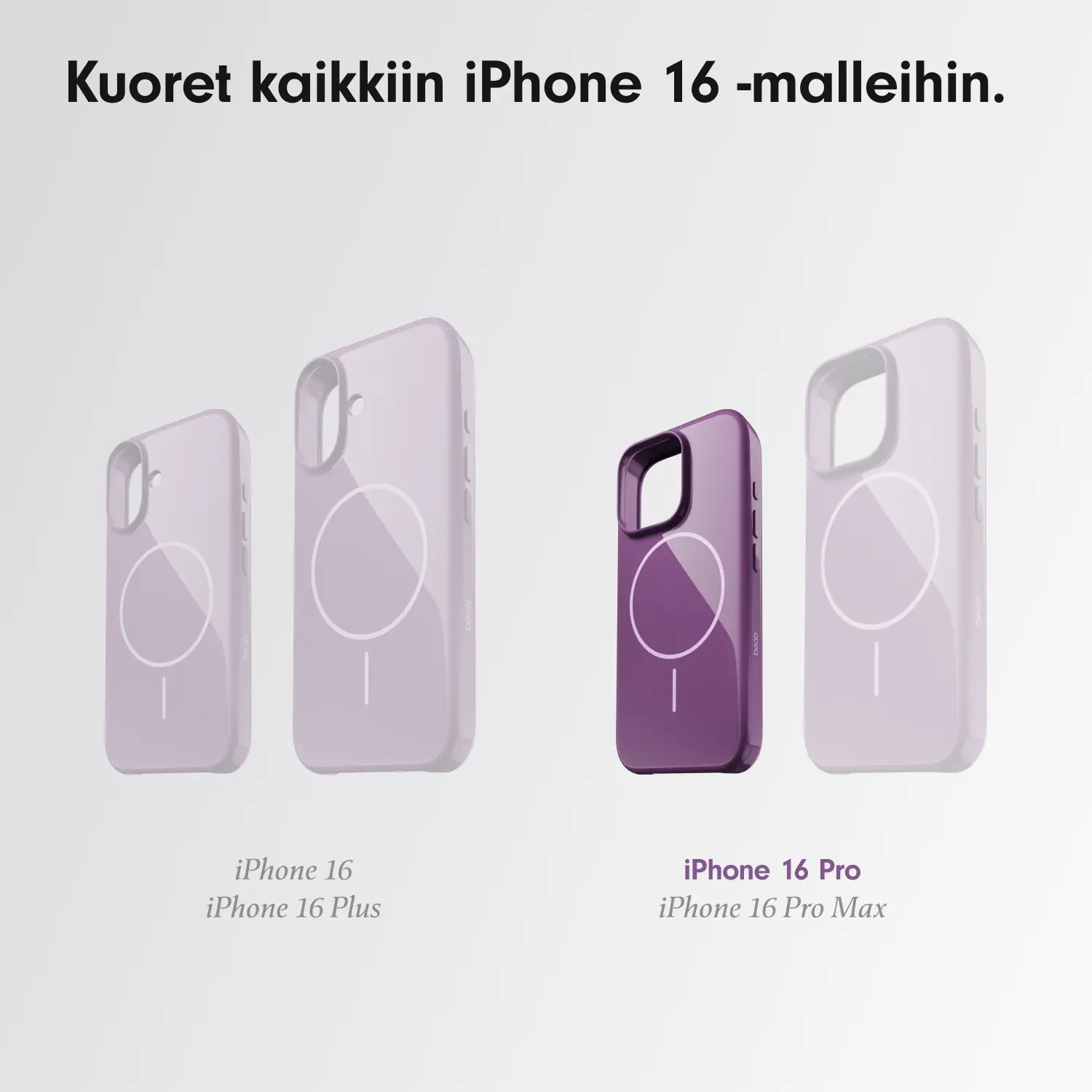 - Kaikki neljä kuorikokoa ovat MagSafe-yhteensopivia, ja niiden sisäiset magneetit kohdistuvat täydellisesti vastaavaan iPhone 16 -malliin varmistaen helpon kiinnityksen ja tehokkaan langattoman latauksen.