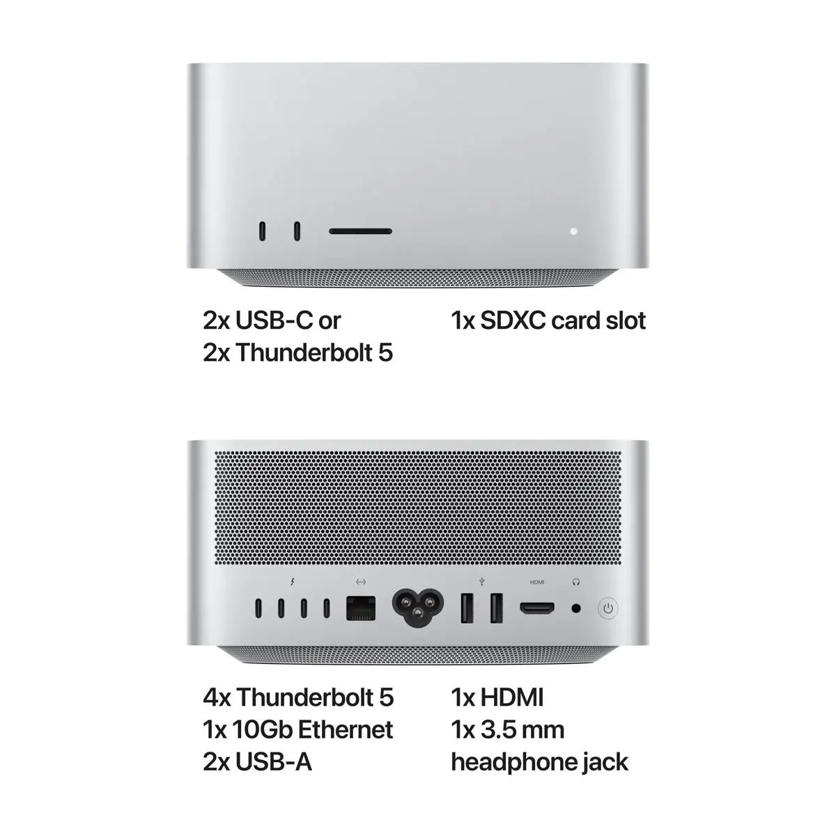 - HUIPPUYHTEYDET – Mac Studiossa on jopa kuusi Thunderbolt 5 porttia ja kaksi USB A-porttia, HDMI-portti, SDXC-korttipaikka ja kuulokeliitäntä. Käytä jopa viittä ulkoista näyttöä M4 Maxilla tai kahdeksaa M3 Ultralla.