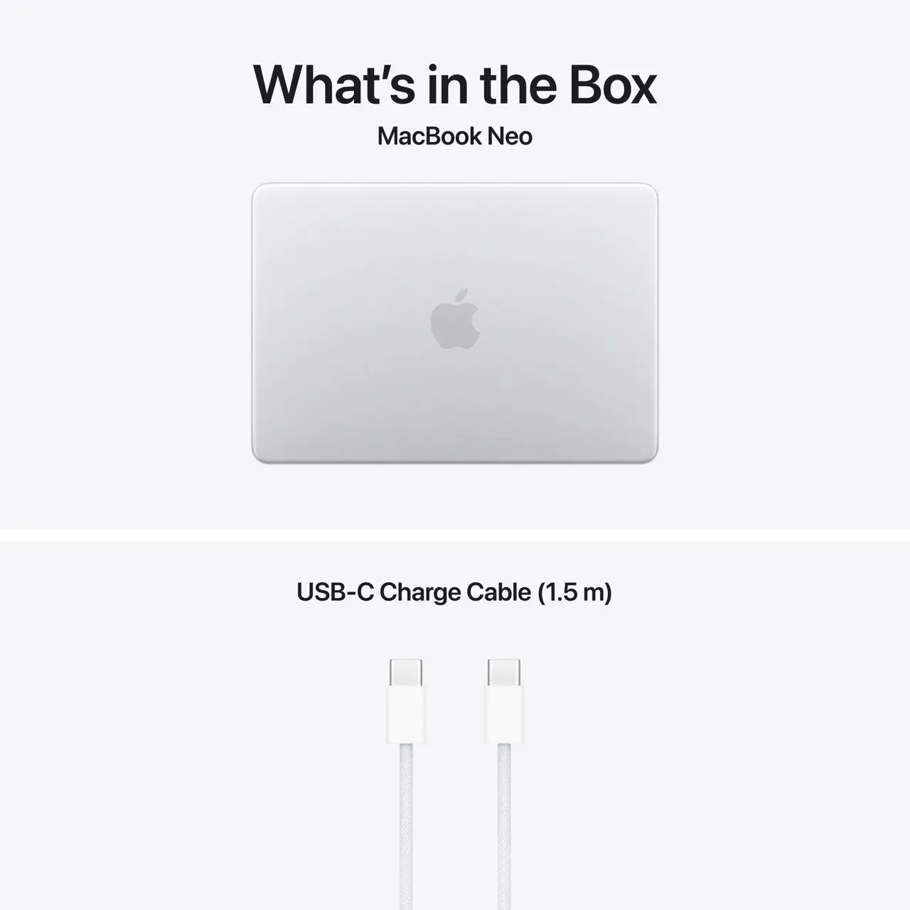 - POWER ADAPTERS — Please be aware: MacBook Neo comes with a USB C charging cable, but does not include a power adapter. A USB C power adapter or other USB PD power source that can provide 20W or higher is required to charge this device. For optimal charging, Apple recommends pairing this Mac with the Apple 20W USB C Power Adapter.