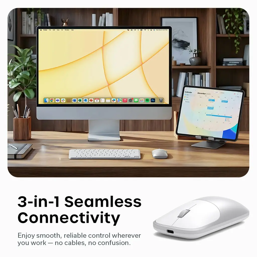 Satechi Slim EX Wireless Mouse on viimeistelty, ergonominen osoitinlaite moderniin monilaitekäyttöön. Kahden Bluetooth-kanavan, USB-C 2.4GHz -vastaanottimen, hiljaisen klikkauksen ja USB-C-latauksen ansiosta se tarjoaa tarkan hallinnan selkeässä, premium-henkisessä muotoilussa, joka istuu saumattomasti sekä työpöytäkokoonpanoon että matkavarusteisiin.