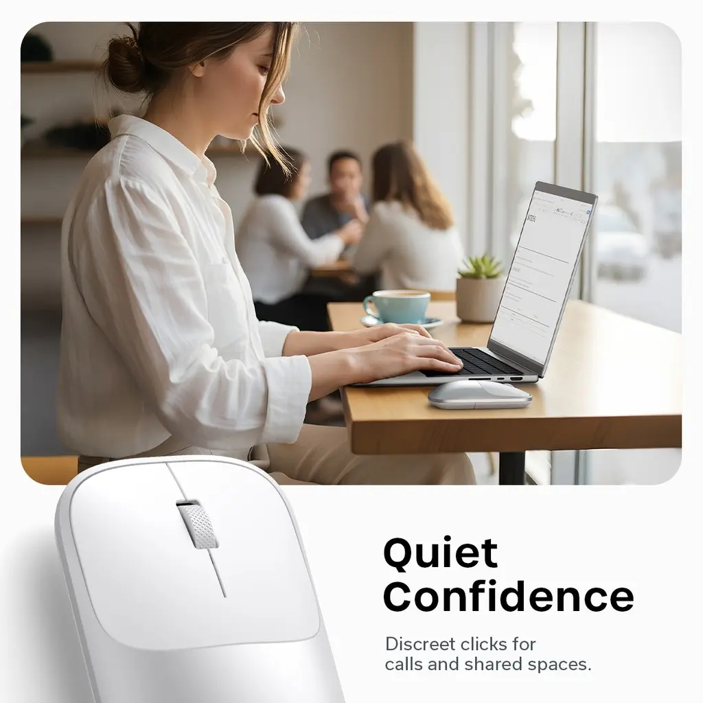 Hiljaiset kytkimet auttavat pysymään huomaamattomana puheluissa ja jaetuissa tiloissa, ja tarkkuuskoneistettu vierityspyörä mahdollistaa sulavan, tasaisen vierityksen päivittäiseen tuottavuustyöhön.