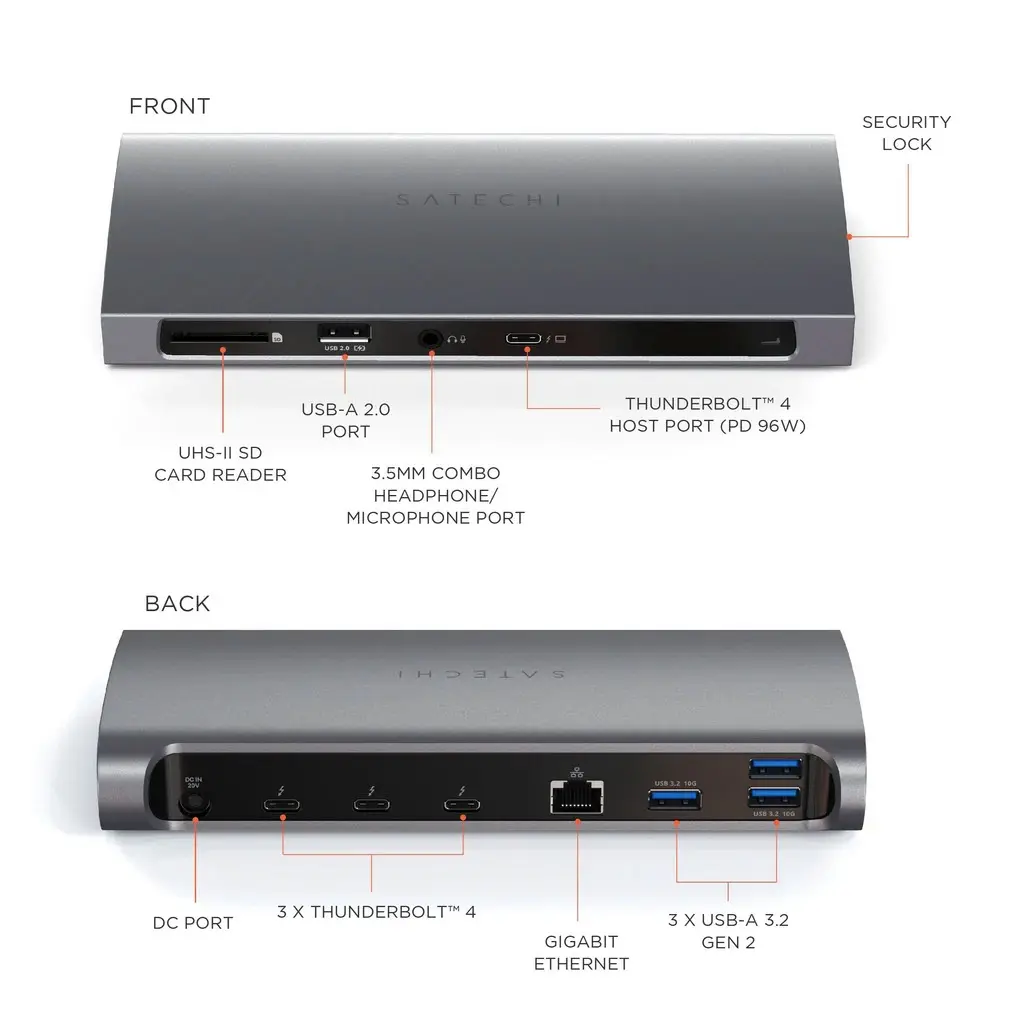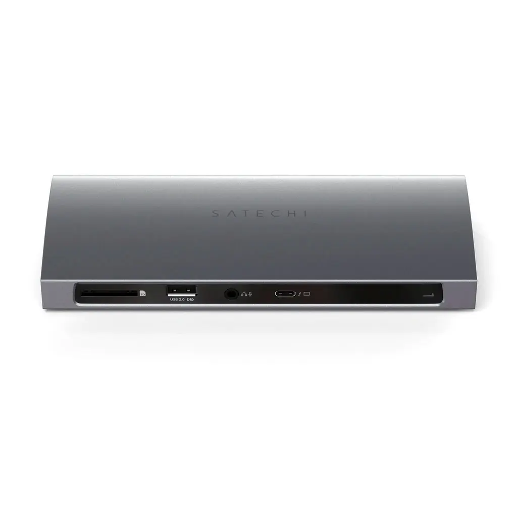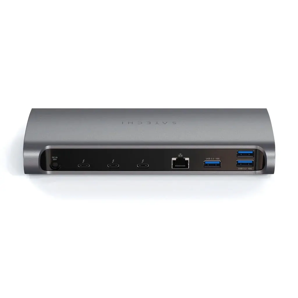 Satechi Thunderbolt 4 Dock – Tehokas ja monipuolinen telakointiasema työtilaasi varten Satechin Thunderbolt 4 Dock nostaa työpisteesi uudelle tasolle tarjoamalla huippuluokan Thunderbolt 4 -teknologian, joka takaa äärimmäisen monipuolisuuden, nopean tiedonsiirron ja tehokkaan latauksen. Tämä all-in-one-telakka sopii täydellisesti vaativaan työskentelyyn. ⸻ Ominaisuudet • Thunderbolt 4 -teknologia: jopa 40 Gbps tiedonsiirto, 15 W porttiteho, kaksi 4K HDMI-videolähtöä • Monipuoliset portit: 3 x Thunderbolt 4, 3 x USB-A 3.2, USB-A 2.0 latausportti, Gigabit Ethernet, UHS-II SD-kortinlukija, 3,5 mm ääniliitäntä • Kaksinkertainen 4K HDMI-videolähtö rikkaaseen visuaaliseen kokemukseen • Power Delivery -lataus jopa 96 W – pitää laitteesi virrassa tehokkaasti • Kompakti ja kevyt: mitat 19,5 x 8,5 x 3 cm, paino 422 g ⸻ Pakkaus sisältää • 1 x Thunderbolt 4 Dock • Lataussovitin ⸻ Yhteensopivuus Sopii laajasti MacBook Pro-, MacBook Air-, iMac-, Mac Mini-, Mac Studio- ja iPad Pro -malleihin sekä Windows-laitteisiin, kuten Microsoft Surface ja Dell XPS -sarjoihin.